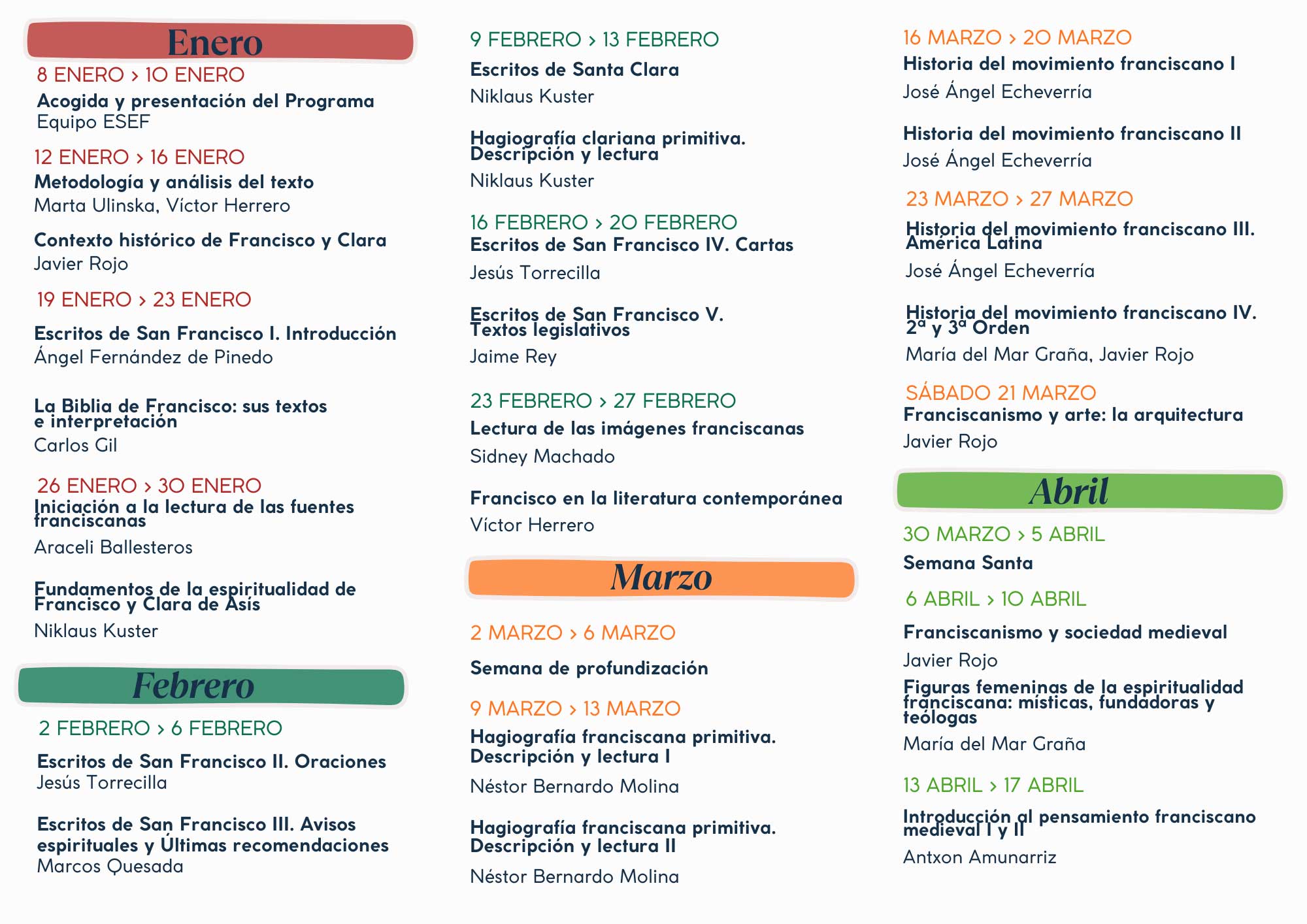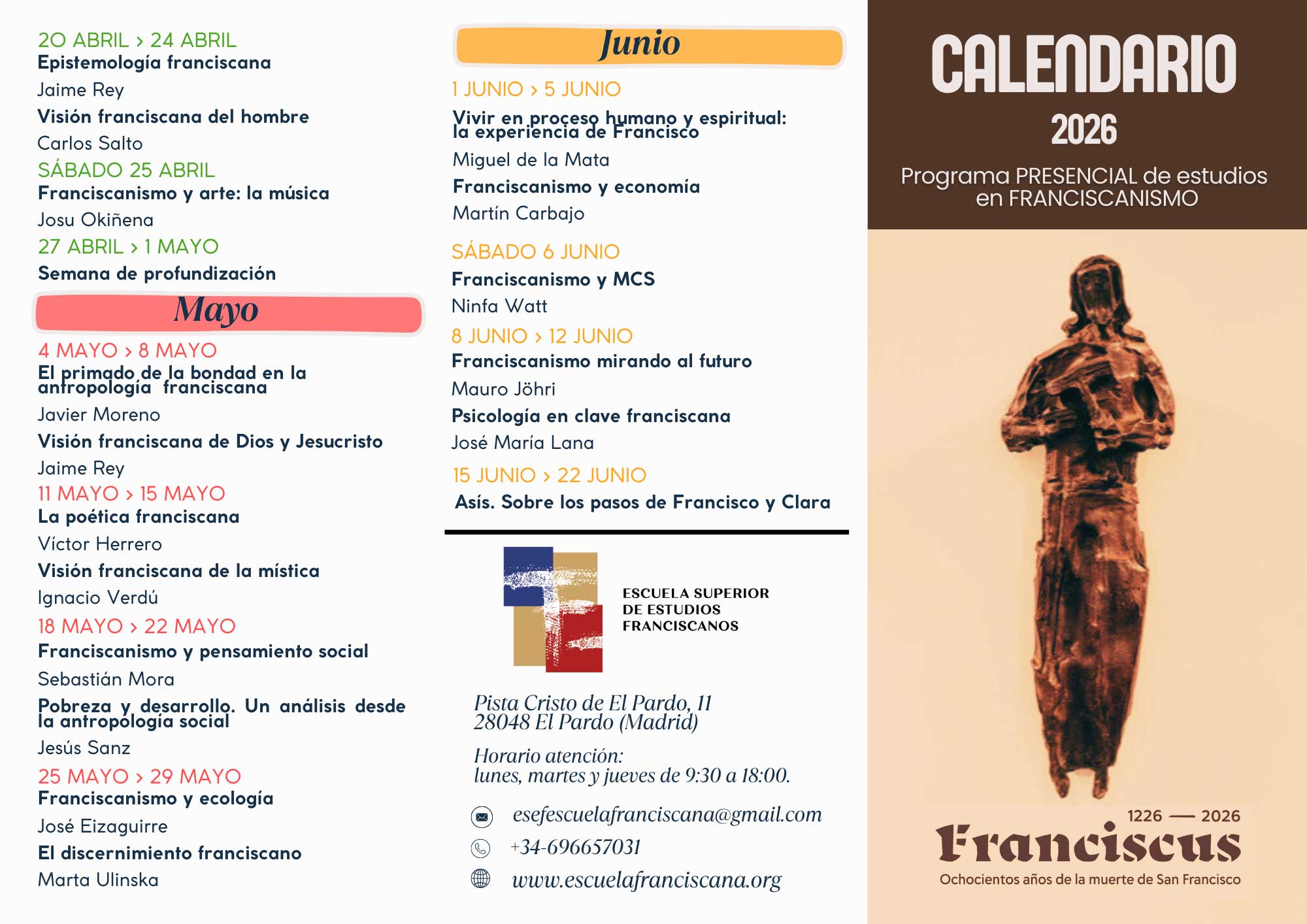 CALENDARIO 2026. Programa PRESENCIAL de estudios en FRANCISCANISMO